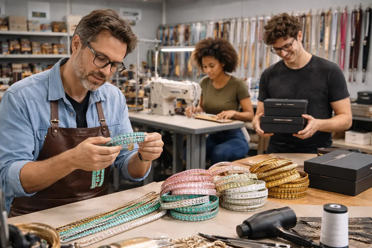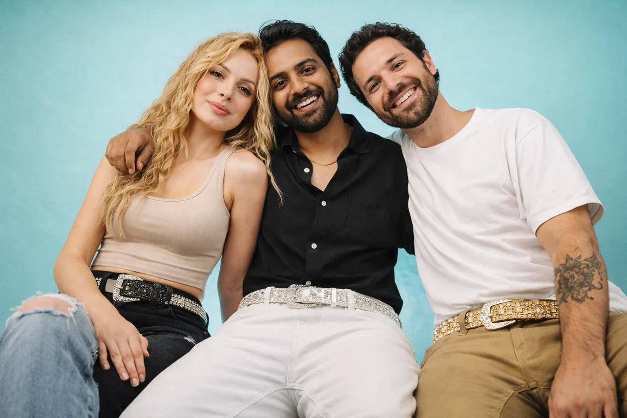Hi! We’re Elvina, Sam, and Hateem. We started this business after our 2015 school costume party, where we made custom rhinestone belts to match our outfits. People loved them, word spread, and demand kept growing, so we decided to share rhinestone belts with everyone.